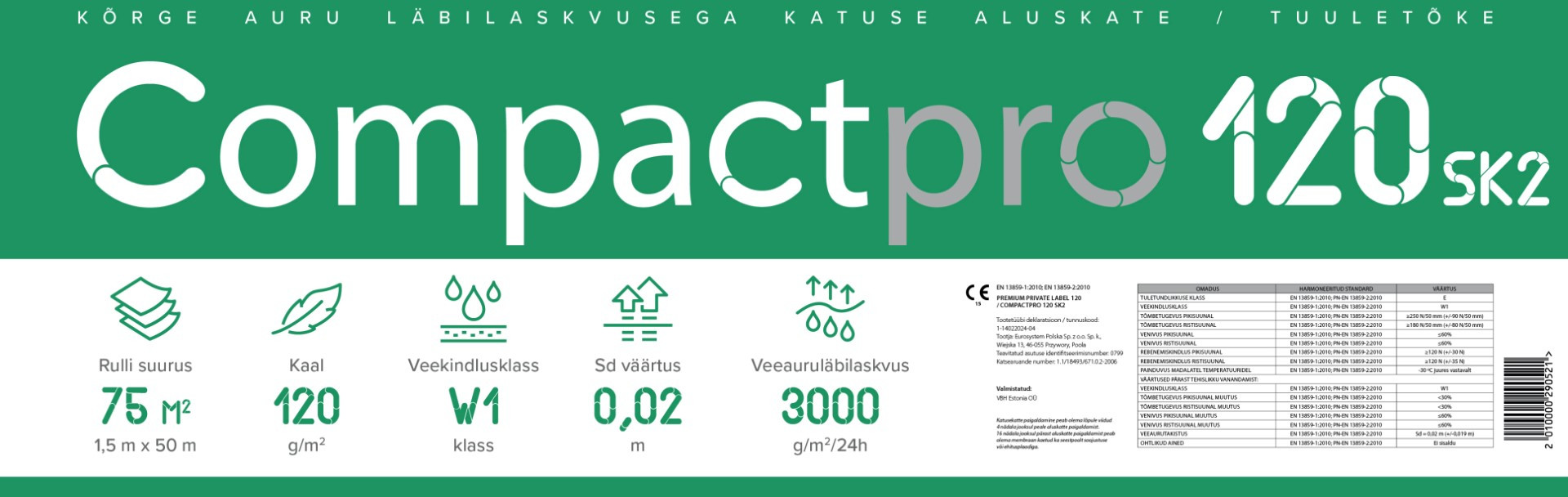 Compactpro 120 SK2 - kahe teibiga hingav katuse aluskate / tuuletõke 1,5x50m (75m²/rull)