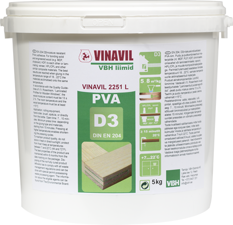 VINAVIL 2251 L on tublide niiskus- ja temperatuurikindlusomadustega PVAc-liim puidu ja puidupõhiste materjalide liimliitmiseks; MDF/HDF pealistamiseks HPL/CPL katetega; spoonimiseks. Sobib nii külm- kui kuumpressimiseks. Lõplik liimliite tugevus: 7 päeva normaaloludes (20ºC; RH ~50%) peale liimimist.